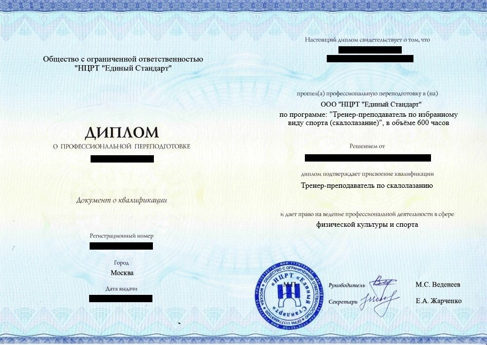 • «Тренер-преподаватель по скалолазанию» с правом ведения профессиональной деятельности в сфере физической культуры и спорта